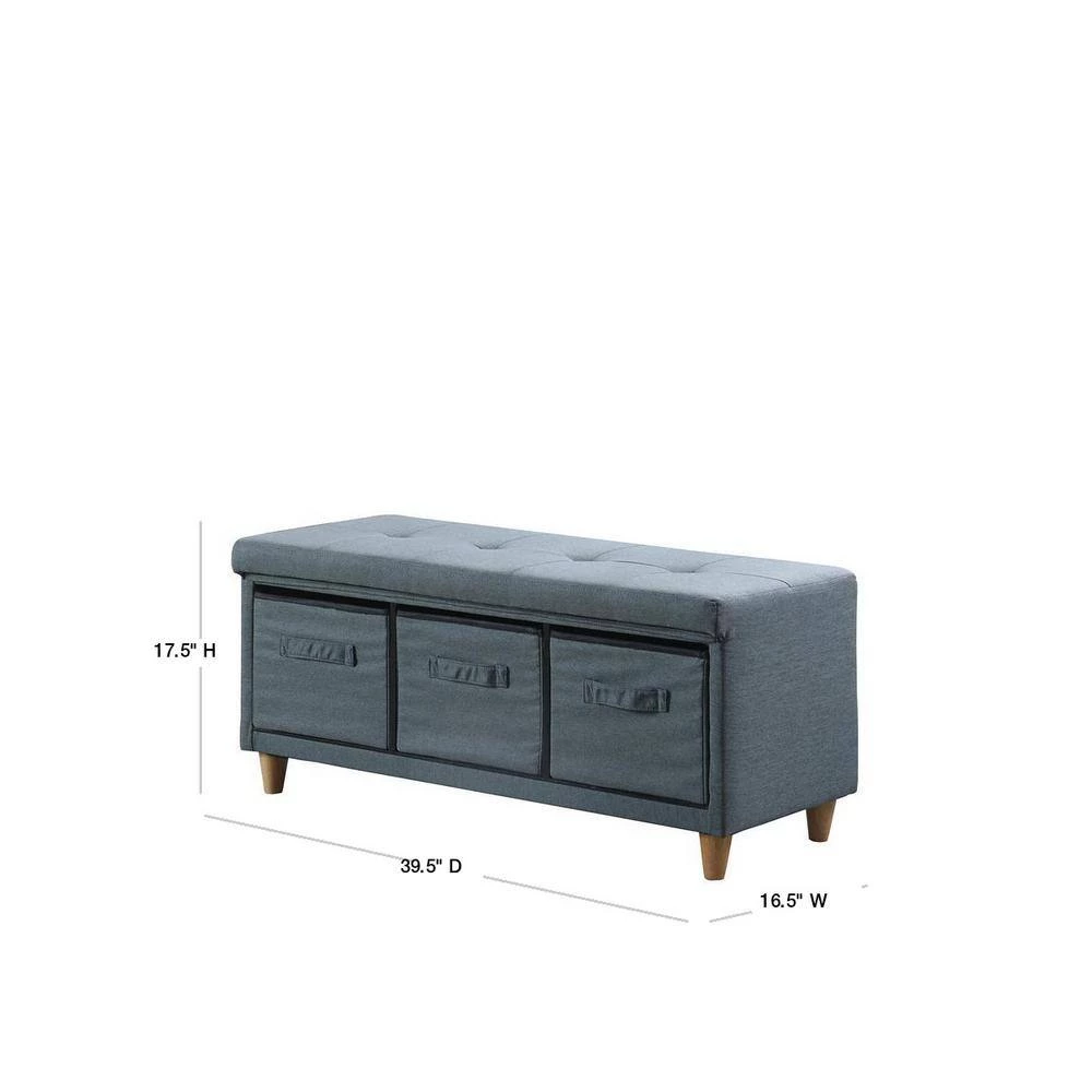 Choosing between beauty and usability will no longer be an issue, once you have the Magnolia Blue gray tufted Storage Bench with 3 piece compartmental removable storage box and handle. It has a simple and sleek tufted design, outfitted with storage cubbies in 3-evenly sizes. Allows you to sit comfortably with extra padding bench cushion and removable fabric storage drawers give it a sophisticated and cozy twist. Perfect in an entryway, at the end of a bed, or in a kids room, the Magnolia tufted Storage Bench offers places to stash shoes, cold-weather accessories, pet essentials, and toys – and ways to keep it all so organized, you’ll wonder if you were ever greeted with such a stress-free arrangement. Crafted with a strengthening engineered wood construction, this classically lined bench boasts central open cubby compartments for shoes or other small items with the included woven fiber baskets for more discreet storage. At the top, a length-wide fabric-covered tufted cushion makes the seat a cozy spot to stop to put on shoes or jackets.