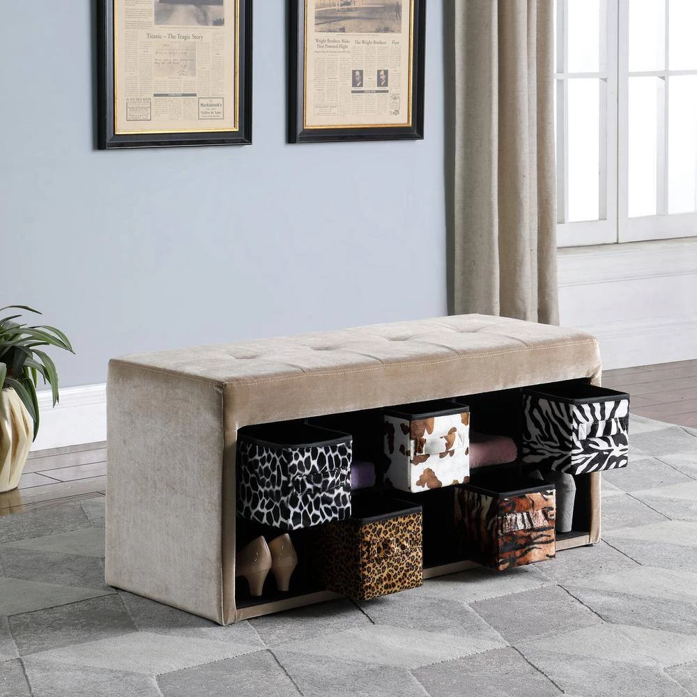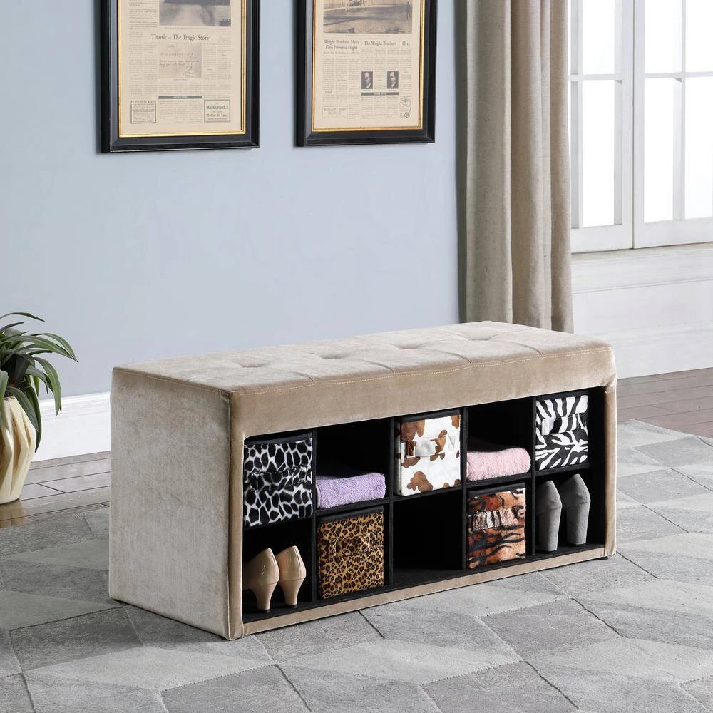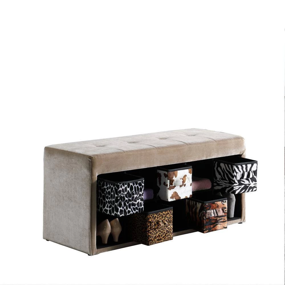 Get organized in the entryway in only an instant with this beautiful Light Brown Cadi velour tufted multi-purpose storage bench. An asymmetrical design gives it a dash of distinction and uniqueness, but this piece is sure to be an instant classic with it’s clean-lined manufactured wood frame, solid light brown velour finish and 10-asymmetrically storage cubicles organization and 5-exotic animal print basket drawers. Use it’s 10-open shelves and five basket drawers to tuck away shoes and out-the-door essentials, then take a seat on it’s light brown-hued polyester velour top tufted cushion. Keep this bench centered on the wall across from your front door to anchor your entryway ensemble, then play in to it’s eccentric charm with a Persian-inspired rug on the floor below and hang up a polished chandelier to brighten your abode. Or, try using it to bring order to your master suite walk-in. It’s the perfect piece to get your accessories organized and make morning prep easier, while you can place throw blankets and pillows stacked on top to keep cozy accents on-hand for chilly nights.