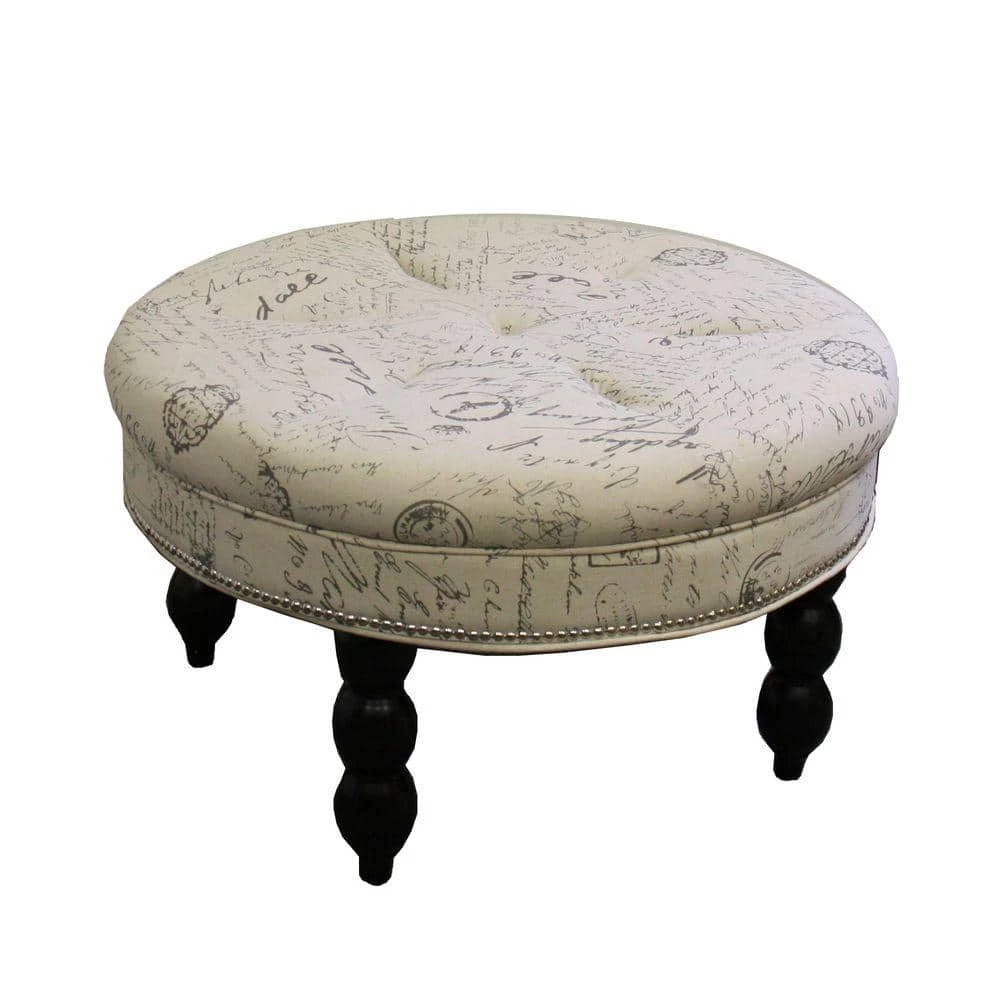 - Ottoman has French script print upholstery and black turned wooden legs made with eucalyptus wood