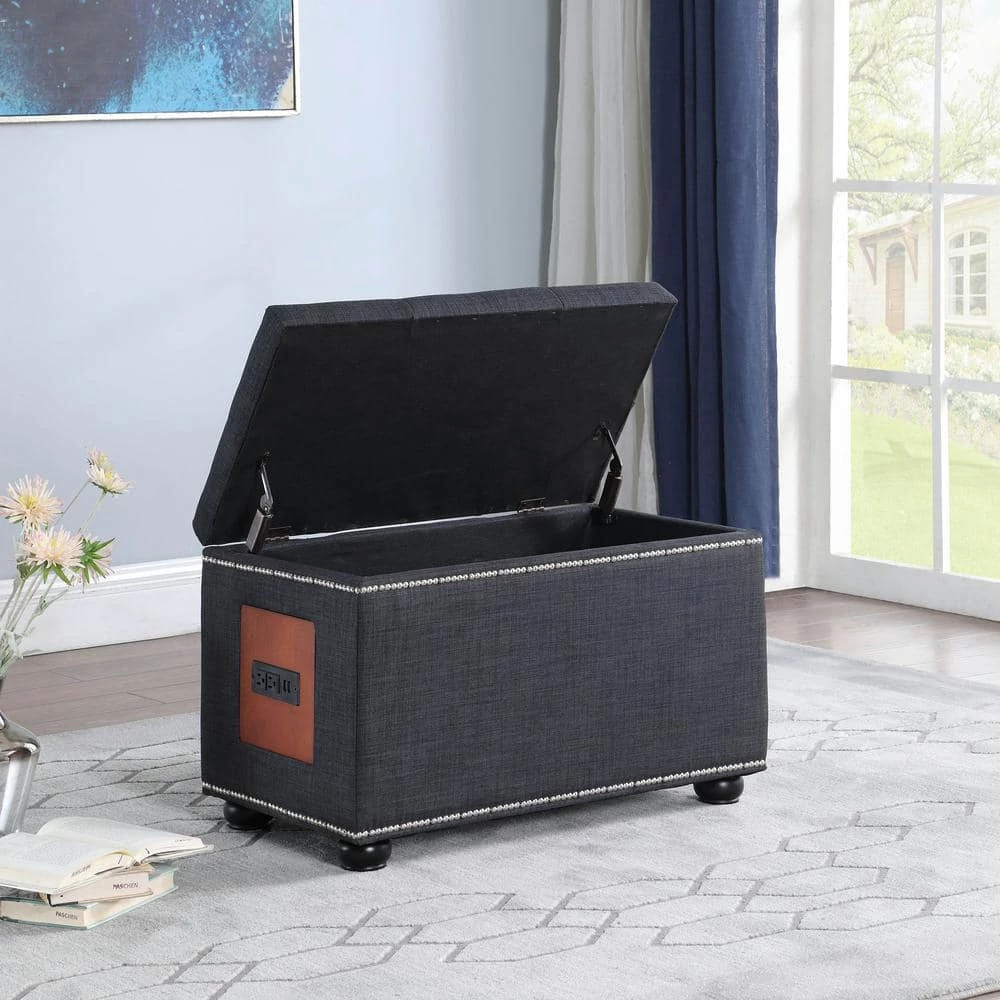 Very First innovative ottoman w/ Charging station placed on the left hand side of the ottoman with 2- outlets and 2-USB ports. Whatever your living room needs & stylish footrest, decorative accent or casual seat gives Dark gray Melo tufted Storage Ottoman has it covered. Unique blend of an innovation with the ability to power your technology on the side of your ottoman. You can easily use your laptop or charge your phone while sitting on your ottoman or use as a footrest while watching TV. A tufted diamond shape surface is decorated in nailhead trim underneath for a refined look, while it’s metal hinged on both sides top opens up to offer an ample storage compartment. Bring versatile elegance to your design with this beautiful, functional ottoman. Clean lines and generously-padded comfort. Bench can be used as convenient accent seating for up to 2-individuals comfortably. Seats lift on smooth gas-powered hinges to reveal 2-distinct storage compartments