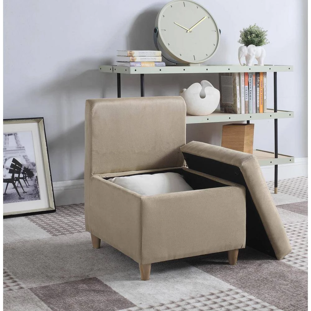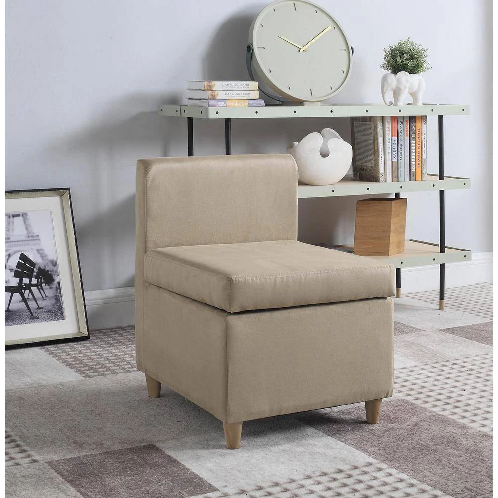 Add an urban touch to your living area with an updated Parson style accent chair. Upholstered in a cream fabric, this comfortable chair has a wide padded seat and under-seat storage. This stylish Cream Accent Chair is designed to adapt to any room while providing additional seating room for you and your guest.