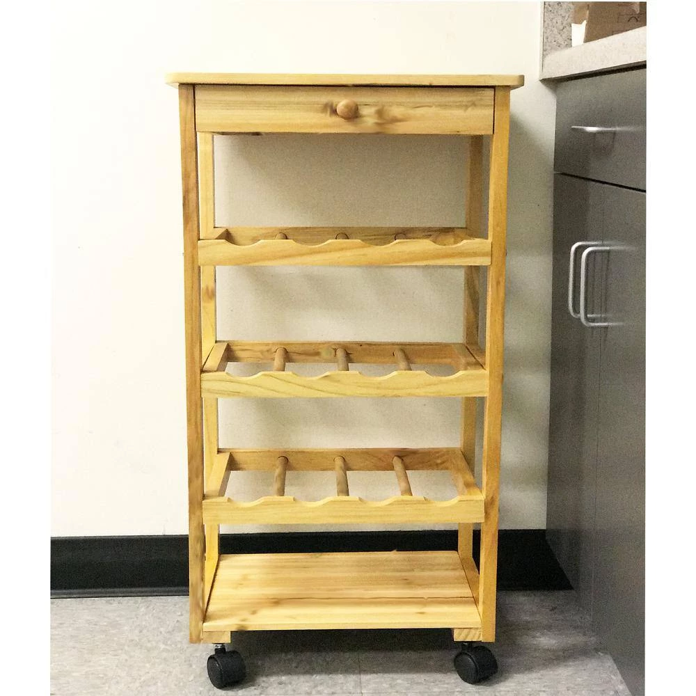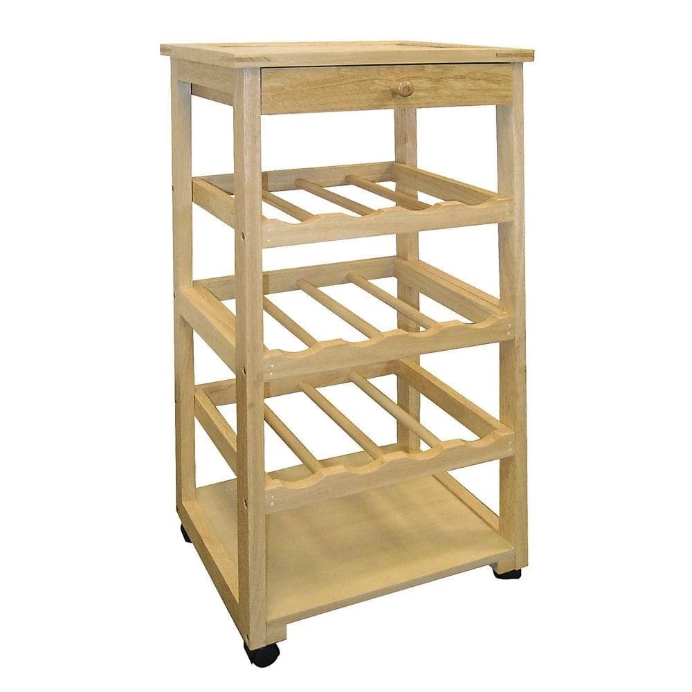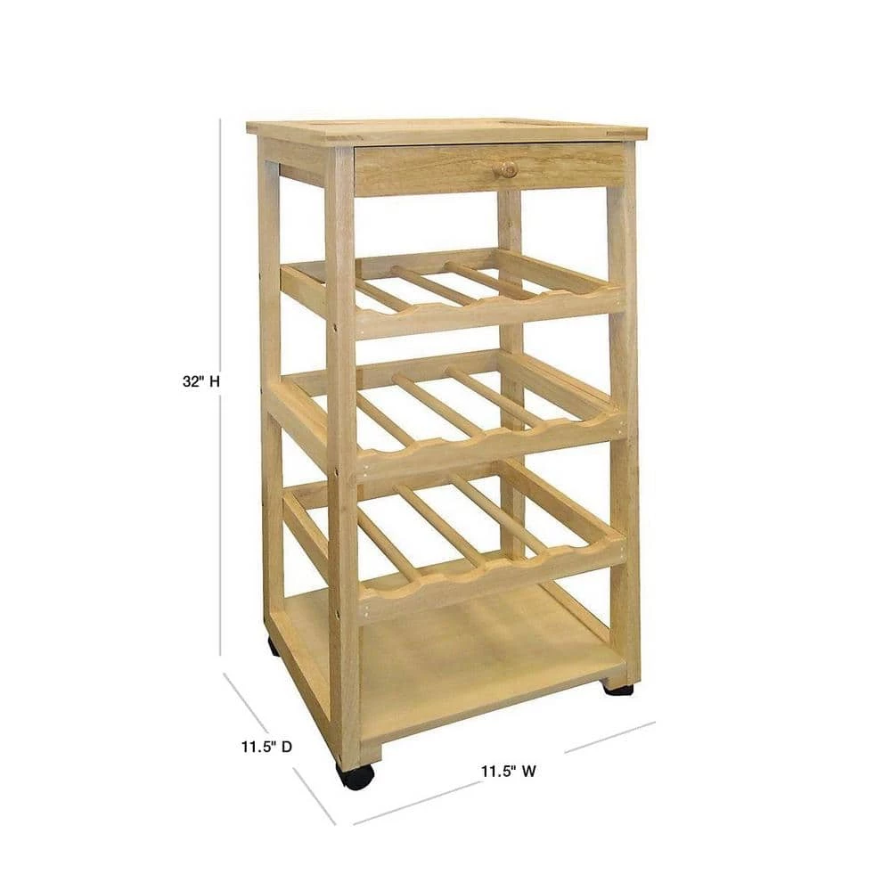 Add kitchen counter space by making this Wooden Wine Rack work for you as a convenient storage solution. 3 shelves offer a perfect place for 12 bottles of wine. Casters on bottom of unit make for easy maneuvering from the kitchen to dining area. Overall dimensions: 15-1/2 in. W x 11 in. D x 32 in. H.