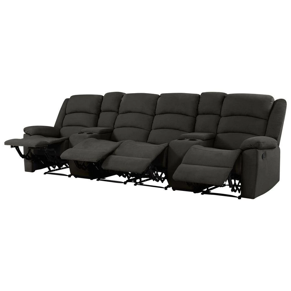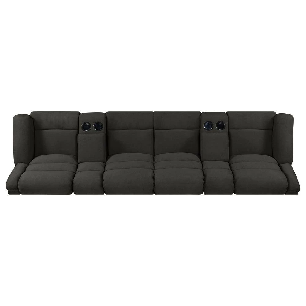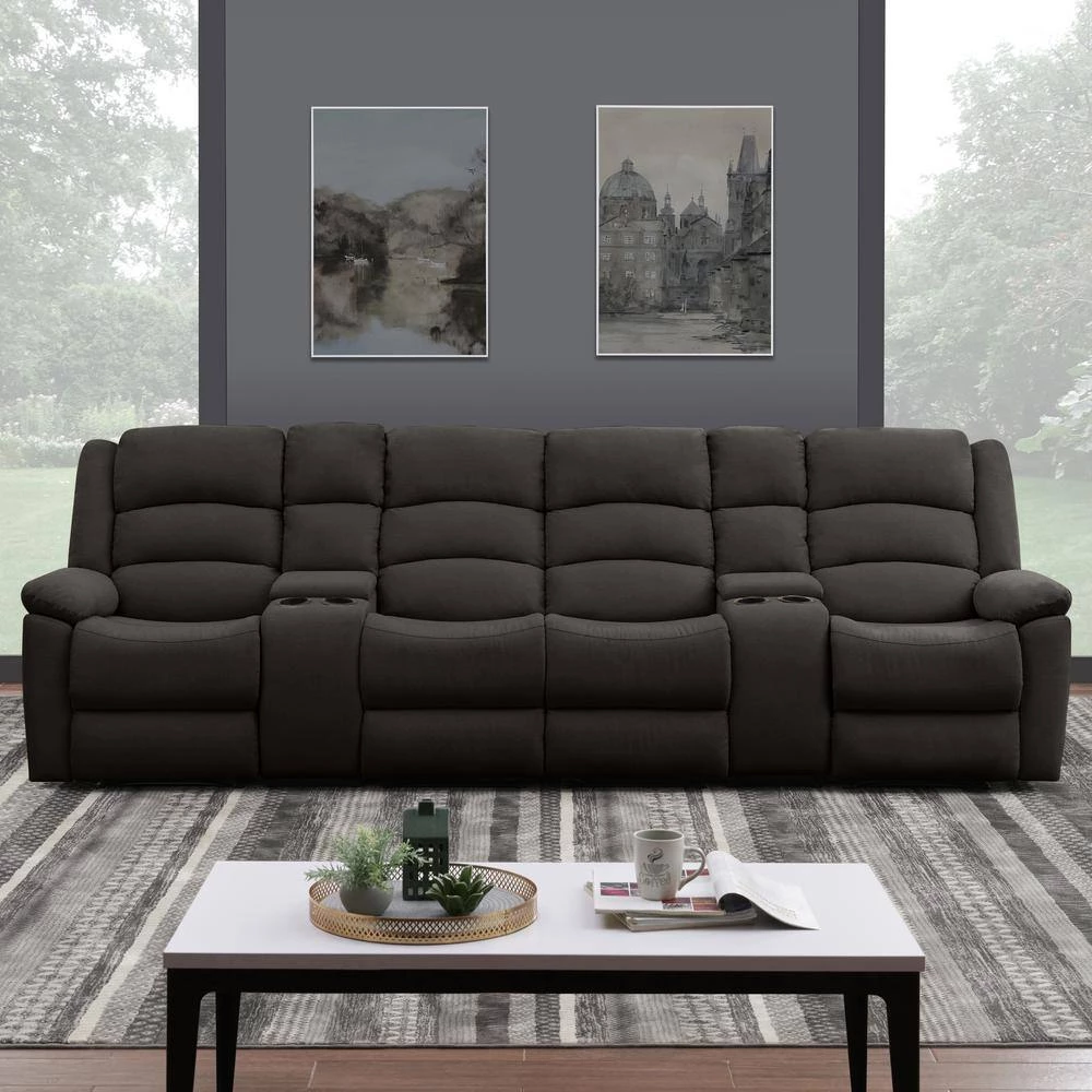 Update your home with this comfortable ProLounger modular wall hugger recliner sofa that sports pillow top arms and a tailored stitched back cushion. The 6-piece sofa recliner includes a left and right reclining arm seat, two armless center reclining seats and two center power consoles that secure together through a button and slot connection on the frames so they will not slip apart. The recliner sofa features easy to open and reach handles for reclining on each end and concealed parachute release cords for the middle seats with two cup holders, deep well storage, two USB ports and two standard outlets in each console that allows you to keep things conveniently close at hand but out of sight as well as to charge your electronic devices. This comfortable sofa is perfect for long-term sitting, TV viewing and relaxed reclining in theater, media and living rooms. Covered in a durable, easy clean 100% Polyester plush low-pile velour fabric. Fully reclined length is 67 in. and fully reclined height is 24.5 in. Each recliner seats up to 300 lbs., so total of 1200 lbs. evenly distributed. Ships in six (6) boxes. UL approved power cords included to plug in each center console. Imported, color may vary.