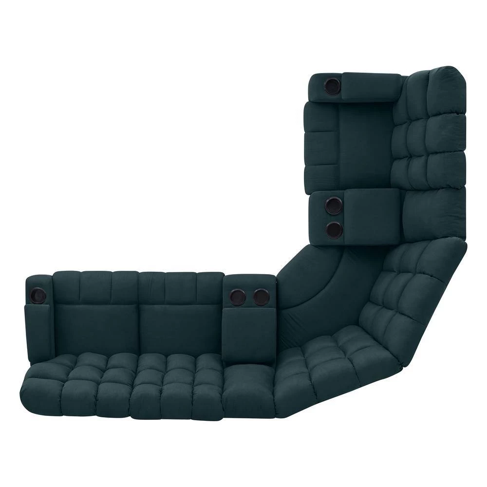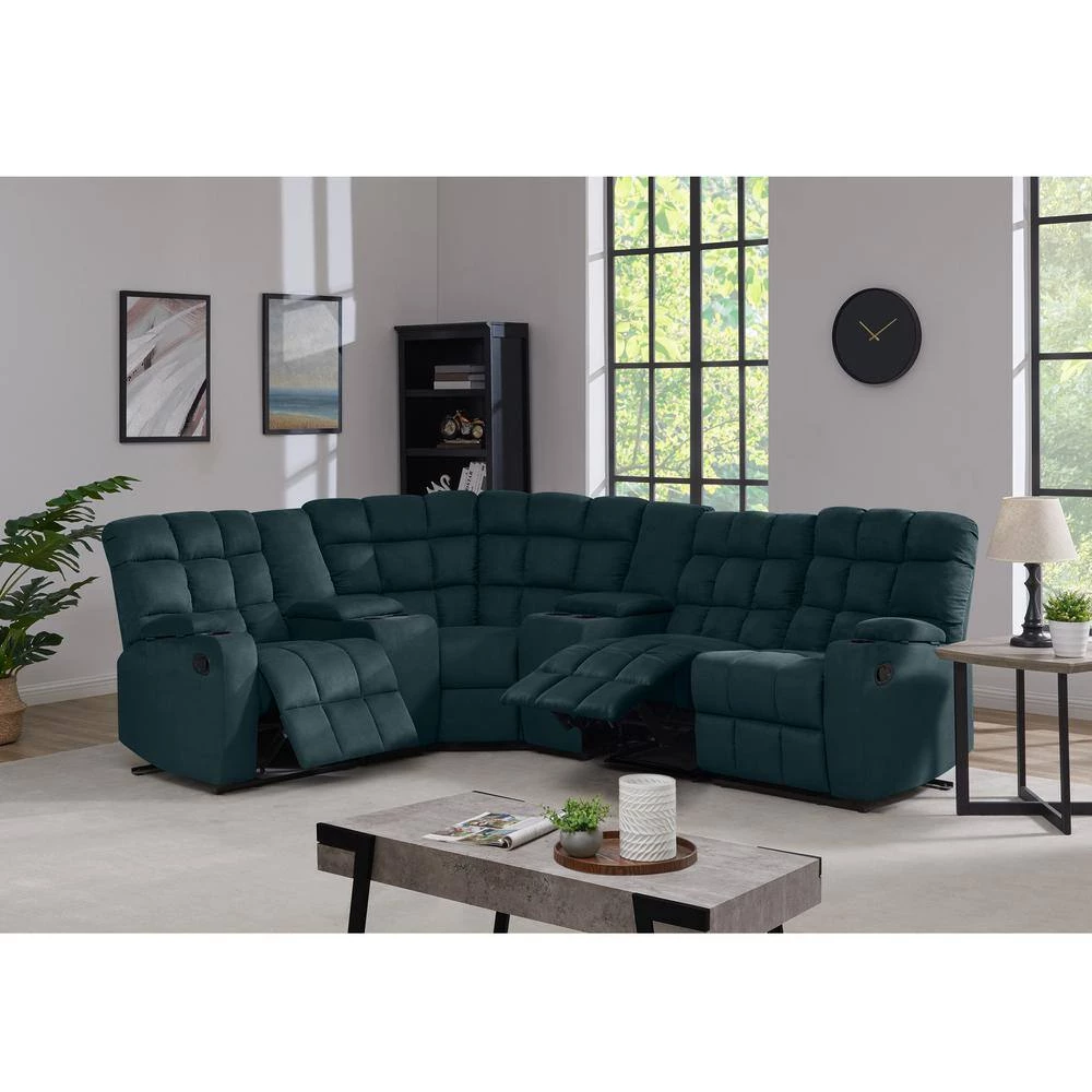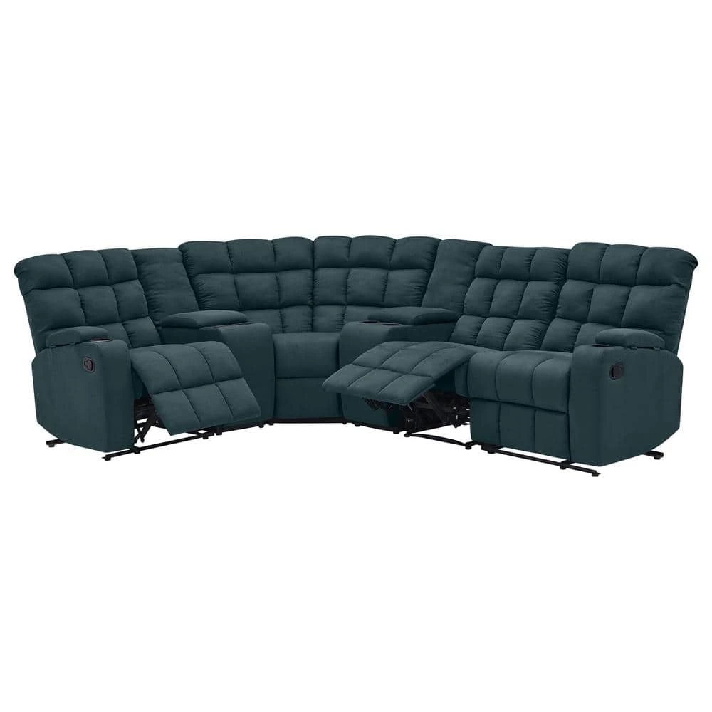 Update your home with this comfortable ProLounger modular sectional that sports pillow top arms and is covered in a durable microfiber fabric. The 6-piece sectional recliner includes a left and right reclining arm seat, an armless center reclining seat, a corner wedge seat and two center consoles that secure together through a button and slot connection on the frames so they will not slip apart. Each arm features an easy to open and reach “car door lever”, cup holder and deep well storage while the middle seat has a concealed parachute release cord to recline. Each center console has 2 cup holders, deep well storage, 2 USB ports and 2 standard outlets allowing you to keep things conveniently close at hand but out of sight as well as to charge your electronic devices. This comfortable sectional is perfect for long-term sitting, TV viewing and relaxed reclining in theater, media and living rooms. Modular capabilities allow for different seating configurations. Corner wedge does not recline but is a comfortable spot to curl up and relax. Covered in a durable, easy clean, stain resistant 100% polyester microfiber fabric. UL approved power cords are included to plug in each center console. Ships in seven (7) boxes. Easy connect no tool assembly, simply slide and click together in less than 45 minutes with included instructions. Imported, color may vary.