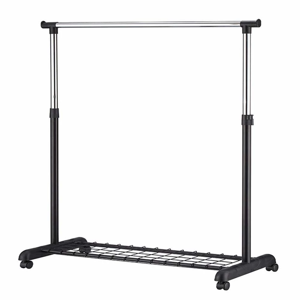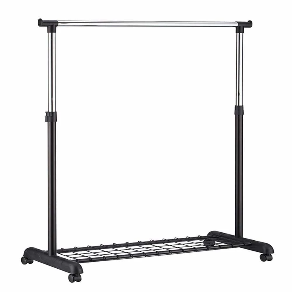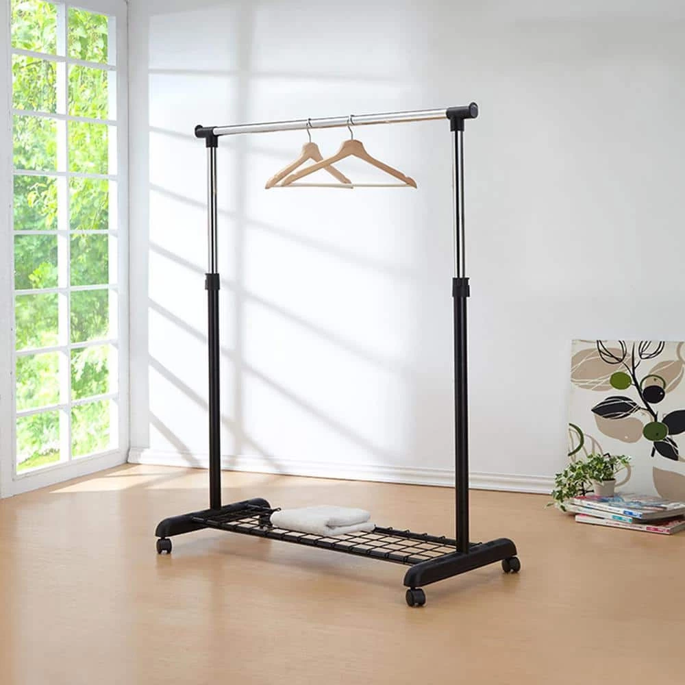 Get organized around the house with the Silver Chrome/Black Coat Hanger Rack w/ wheels. A perfect organizer for anyone who needs hanging space to keep a fit and organized closet. Comes with a Black Bottom Wire Shelf in particular is perfect for holding a variety of items such as clothes, shoes, or any item that you would typically like to have folded up and set aside. Bottom Wire Shelf just sit comfortably with 2 metal bar support securely. Has a built-in Closure Fastener to tighten the Body Pole. Adjustable Height from 39 in. to 68 in. H. Dont get left behind when organizing your closet, try a Closet Storage system that will simplify your life.