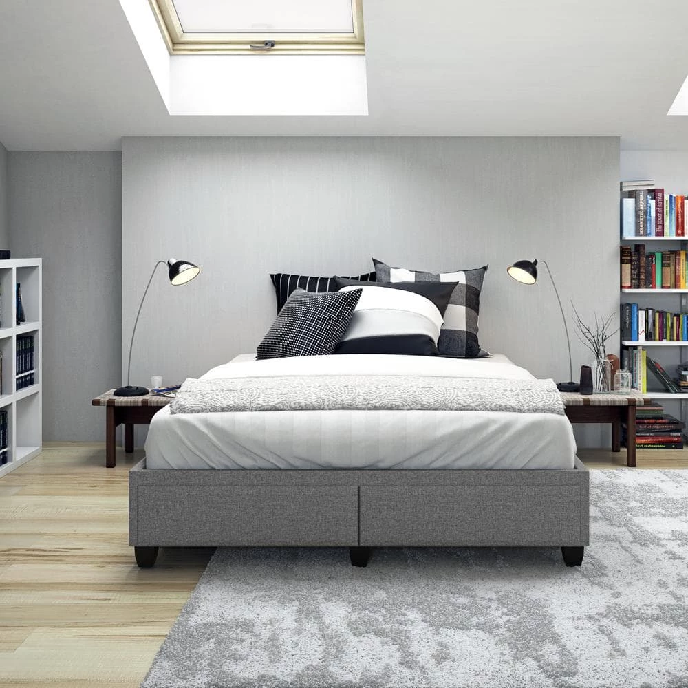 Sleek and modern, this upholstered storage bed base provides 2-large storage drawers to help keep your space organized. Euro side glides on the drawers ensure smooth opens every time. There is no headboard on this bed base, which opens up options for a minimalist appearance, while maintaining support and storage function. All sides are upholstered and slightly padded for a premium look and feel. The storage drawer deck comes pre-assembled and provides solid support at the foot of the bed. That plus the 8 cross slats provide a durable support system that easily supports up to 700 lbs. No box spring required. The top of the bed base is just over 11 in. high. Entire bed ships in 1-box for easy transport. Bed assembles in under 15 minutes and all hardware is included. Limited 1 Year Warranty.