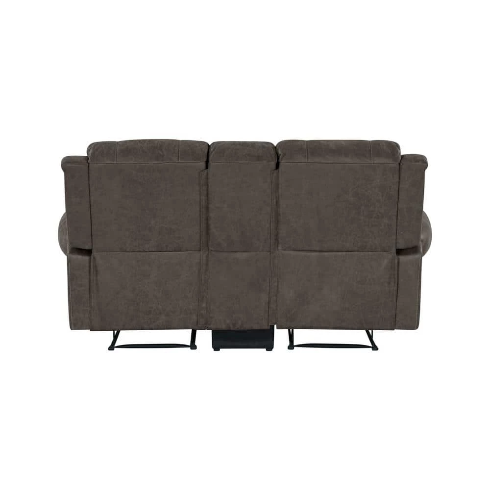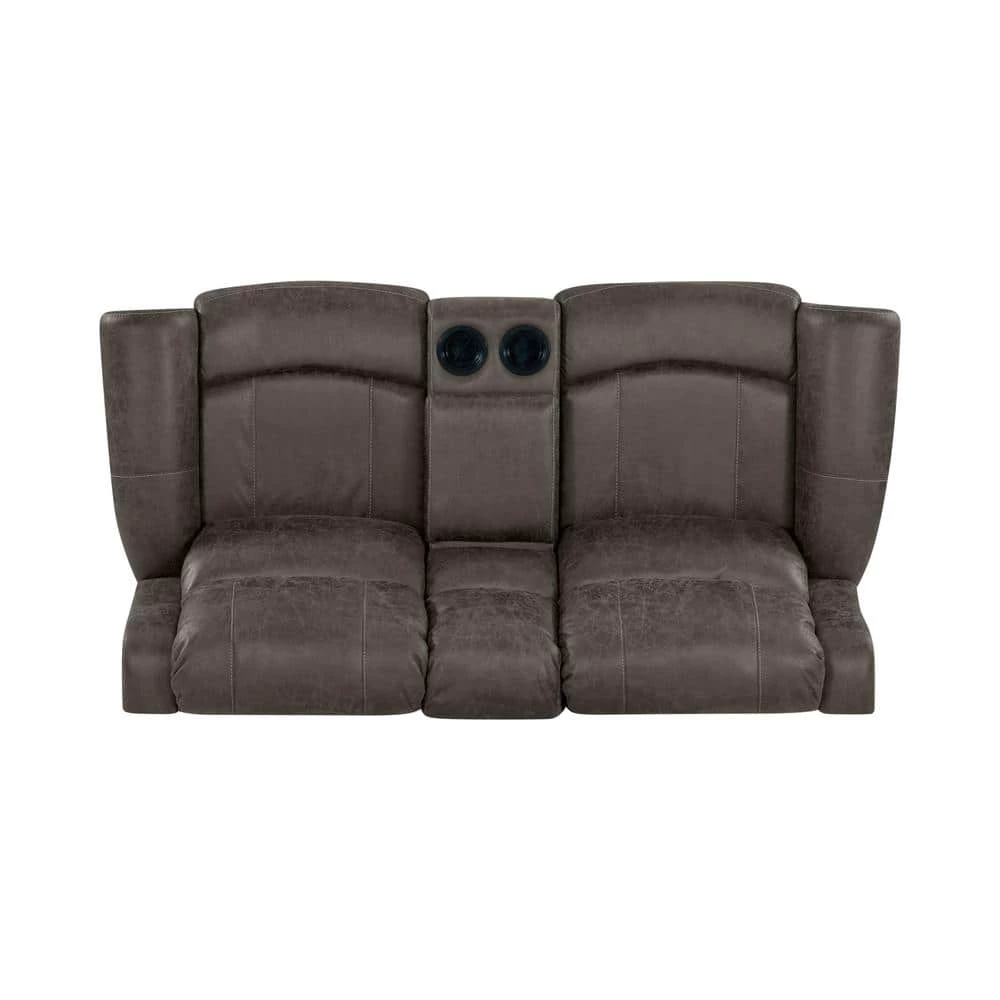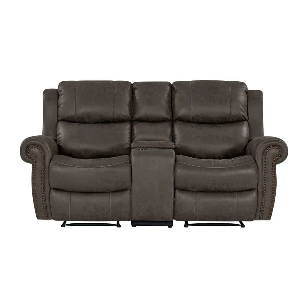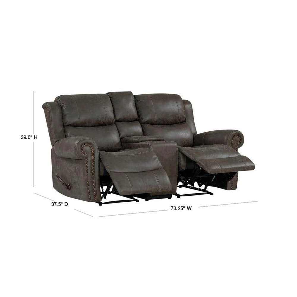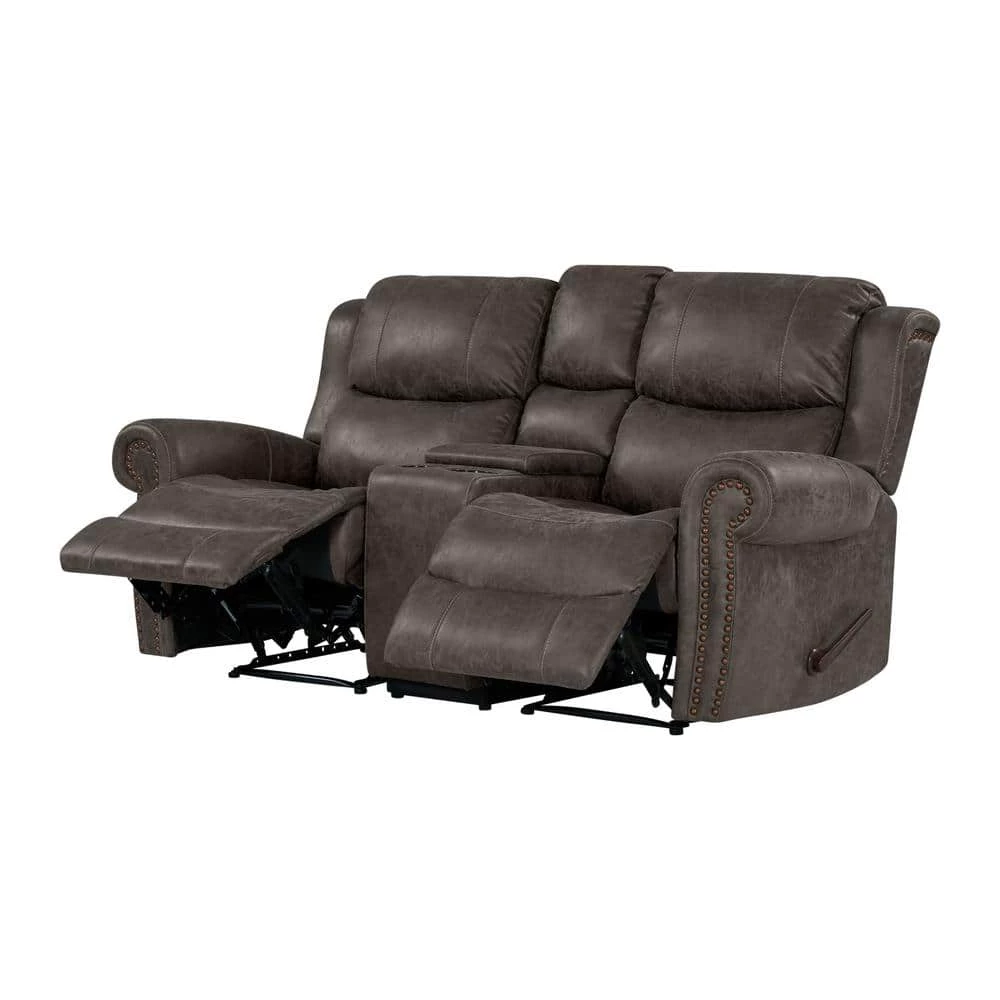 Update your home with this comfortable ProLounger modular loveseat featuring rolled arms with hand tacked bronze nail head trim for added detail. The three piece loveseat recliner includes a left and right reclining arm seat and a center power console that secure together through a button and slot connection on the frames so they will not slip apart. The wall hugger recliner loveseat features easy to open and reach handles on each end for reclining with a center upholstered console equipped with 2 cup holders, deep well storage, 2 USB ports and 2 standard outlets that allows you to keep things conveniently close at hand but out of sight while charging your electronic devices. This comfortable loveseat is perfect for long-term sitting, TV viewing and relaxed reclining in theater, media and living rooms. Covered in a stain resistant, easy clean 100% polyester distressed faux leather fabric. Each recliner is 64.5 in. fully reclined, 45 in. from the back of the seat to the footrest, 19.5 in. from the seat to the top of the recliner. UL approved power cord is included to plug in the center console. Ships in three (3) boxes. Each recliner seats up to 300 lbs. Easy connect no tool assembly, simply slide and click together in less than 30 minutes with included instructions. Imported, color may vary.