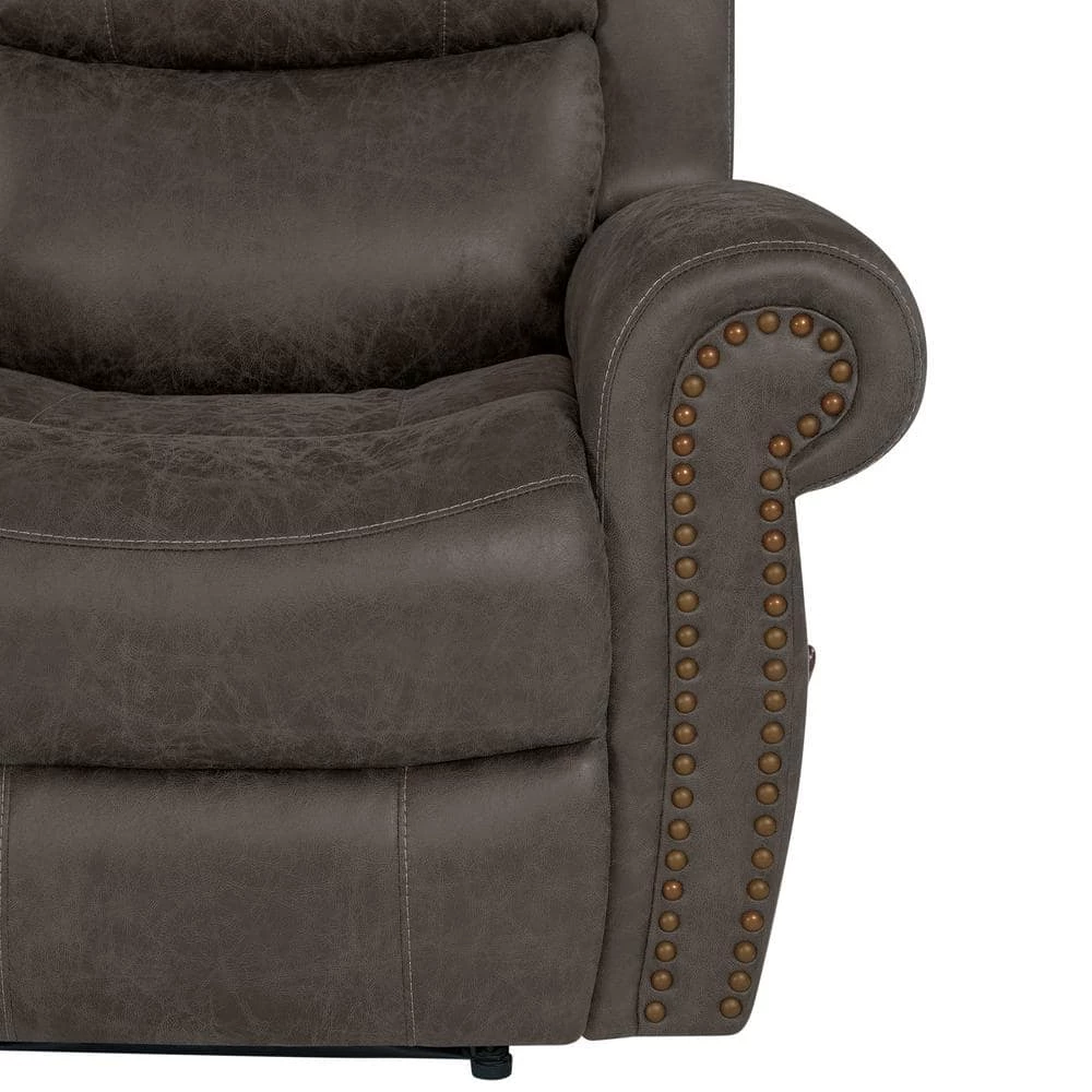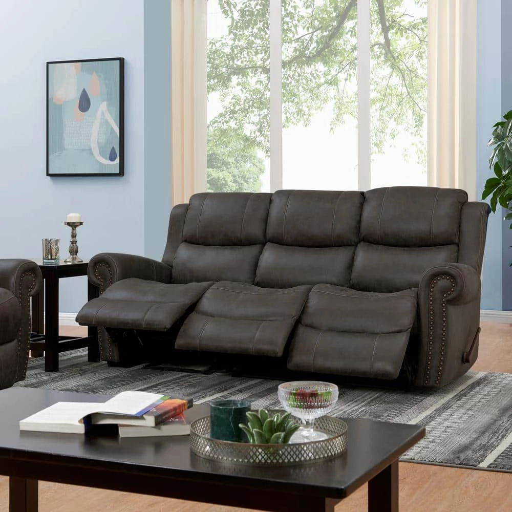 Update your home with this comfortable ProLounger modular sofa featuring rolled arms with hand tacked bronze nail head trim for added detail. The three piece sofa recliner includes a left and right reclining arm seat and an armless center reclining seat that secure together through a button and slot connection on the frames so they will not slip apart. The wall hugger recliner sofa features easy to open and reach handles for reclining on each end and a concealed parachute release cord to recline the middle seat. This comfortable sofa is perfect for long-term sitting, TV viewing and relaxed reclining in theater, media and living rooms. Covered in a stain resistant, easy clean 100% polyester distressed faux leather fabric. Each recliner is 64.5 in. fully reclined, 45 in. from the back of the seat to the footrest, 19.5 in. from the seat to the top of the recliner. Ships in three (3) boxes. Each recliner seats up to 300 lbs. Easy connect no tool assembly, simply slide and click together in less than 25 minutes with included instructions. Imported, color may vary.