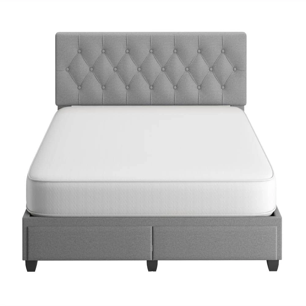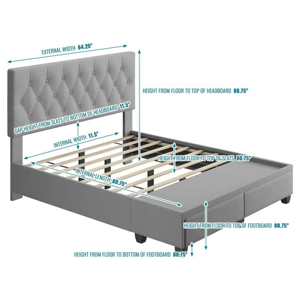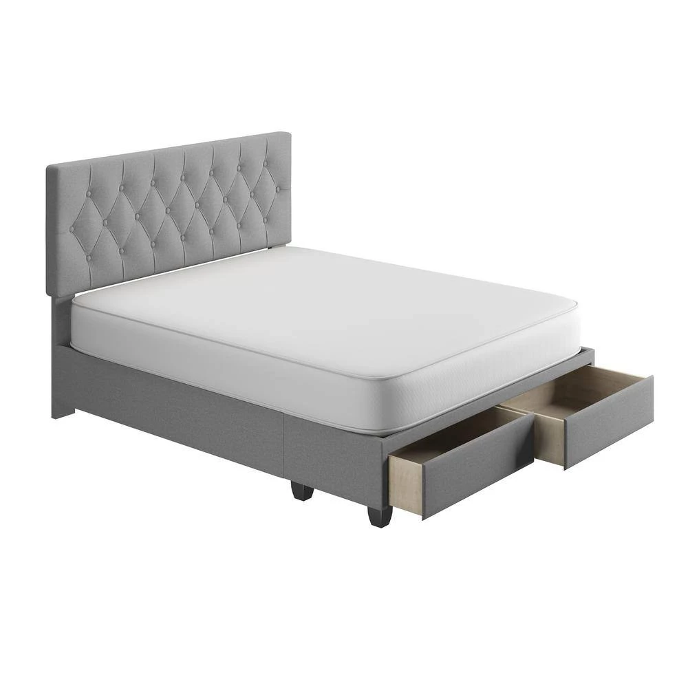 The Everleigh Upholstered Platform Storage Bed from Rest Rite features a button-tufted headboard and storage deck with 2 drawers at the foot of the bed. This platform bed is fully upholstered from the button-tufted headboard to the footboard in a durable linen fabric. The storage deck at the foot of the bed features 2 easy-glide drawers that pull from the foot of the bed for convenient access anytime. The support base includes a solid section over the storage drawers at the foot of the base, and a full slat system. The bed base weight limit is 700 pounds. A box spring is not required with this platform base. Compatible with any type mattress. The bed ships in 1 box for easy transport. The entire foot of the bed, including the storage drawers comes fully assembled, making set up a breeze. All hardware is included, shipped safely zipped up in the back of the headboard.