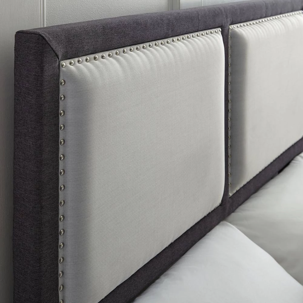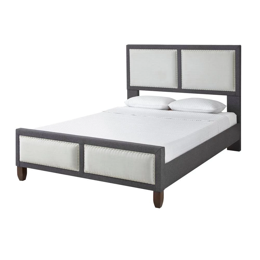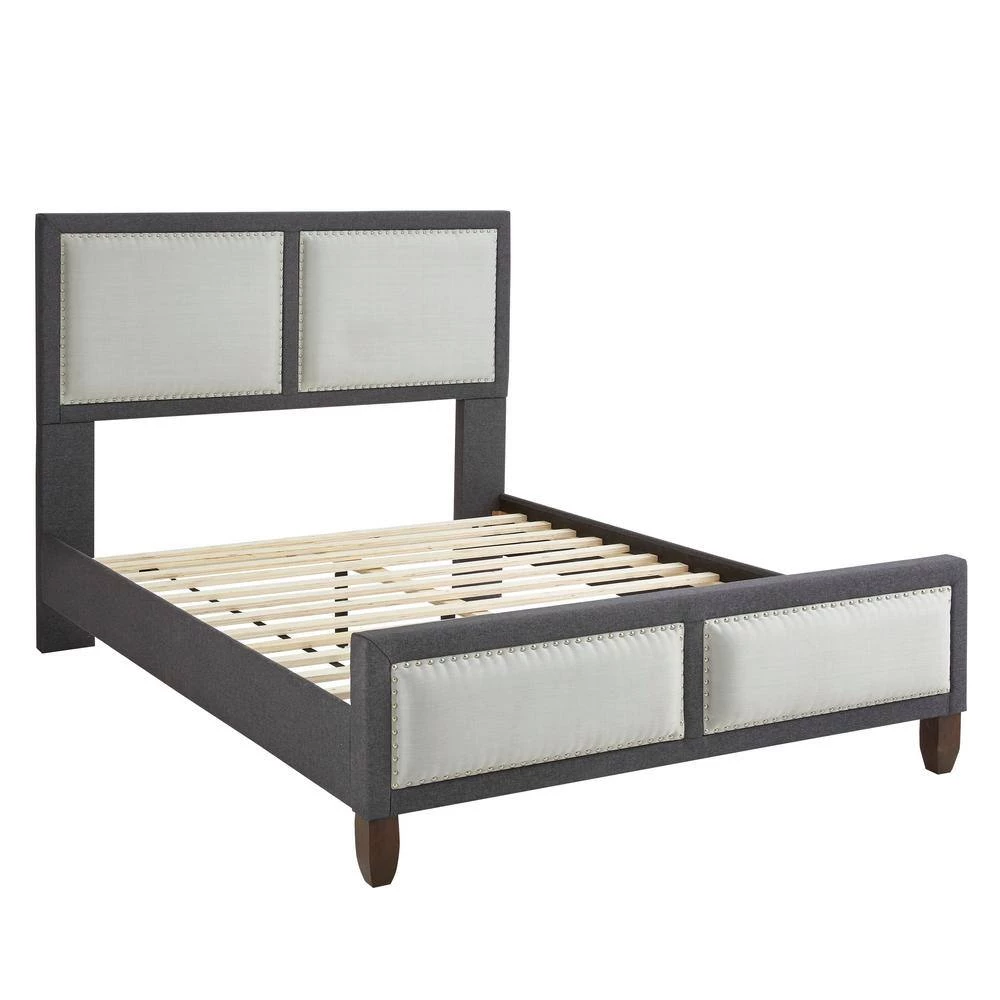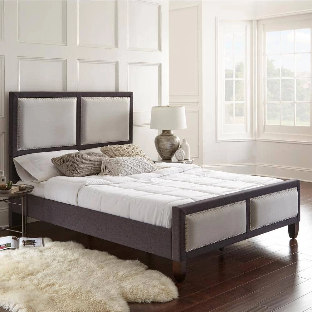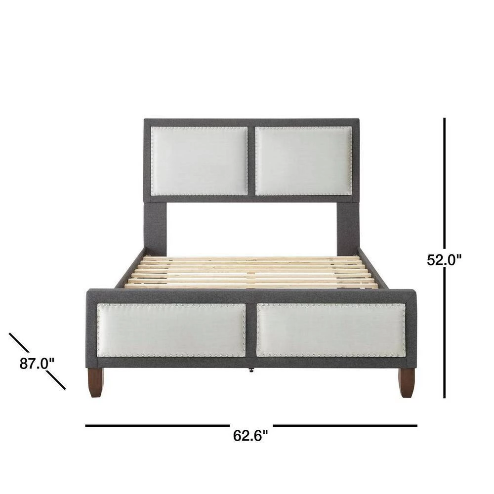 Rest Rite Queen Mallory Panel Upholstered Platform Bed Frame will add a modern flair to your bedroom. Features include nail-head trim with light square accents. Set includes headboard, footboard, bed rails, and slats. No box spring is required and accommodates 700 lbs. Equipped with a one year warranty. Products is available in brown and gray upholstery. Size: 62.6 in. W x 87.5 in. D x 52 in. H.