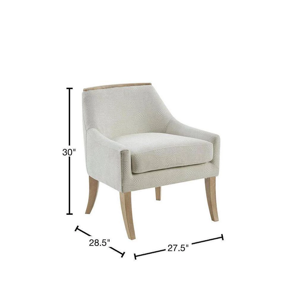 Complete your home decor with the chic style of the Madison Park Milana Accent Chair. This accent chair is upholstered in a geometric jacquard fabric that creates a stunning transitional look with a soft hand-feel. The low back and recessed arms provide an elegant silhouette, while the exposed wood at the top complements the design. Solid wood legs match the exposed wood on the back and provide a sturdy base. Add this accent chair to your living room decor and elevate the look of your space.