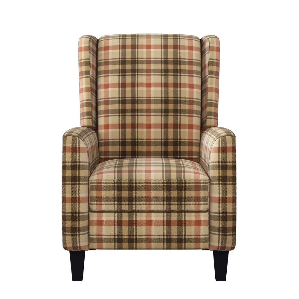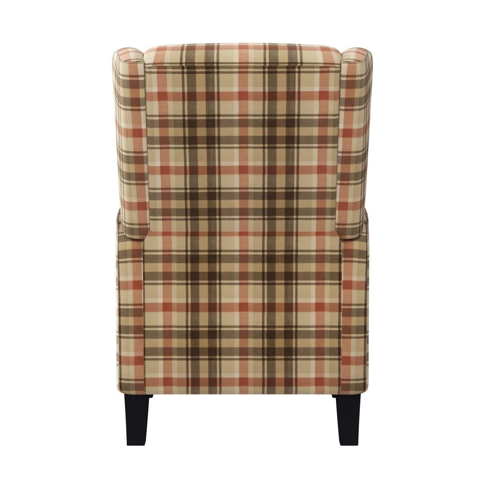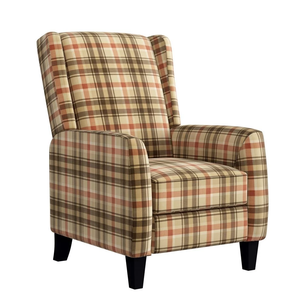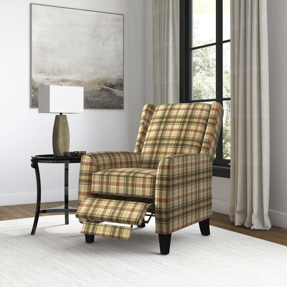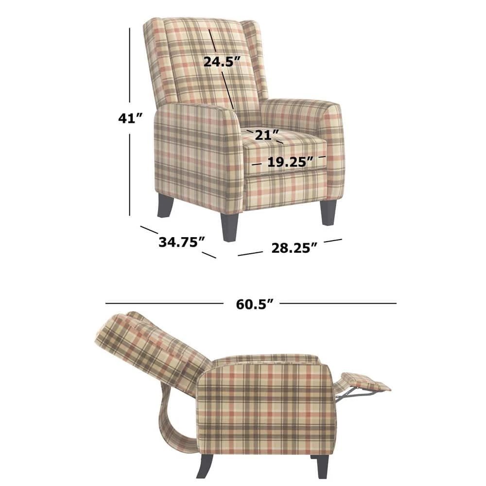 This push back recliner with footrest offers a modern update on the traditional wing back armchair. The recliner features a square back and square arms for a neat, tailored touch. Recliner is 60.5 in. long and 30 in. high when fully reclined. Requires 12.5 in. back clearance and 16.5 in. front clearance to recline. Easy connect no tool assembly, simply slide and click together to assemble with included instructions. Imported, color may vary.
