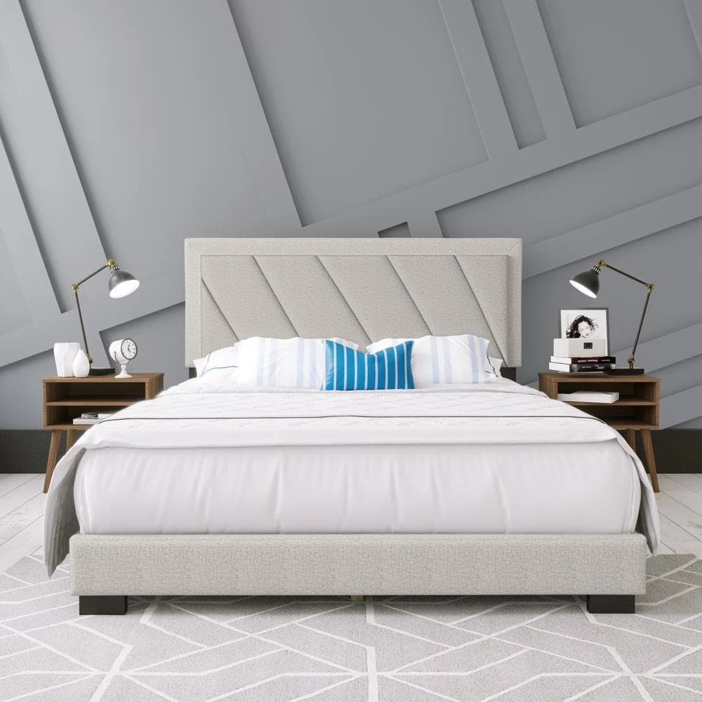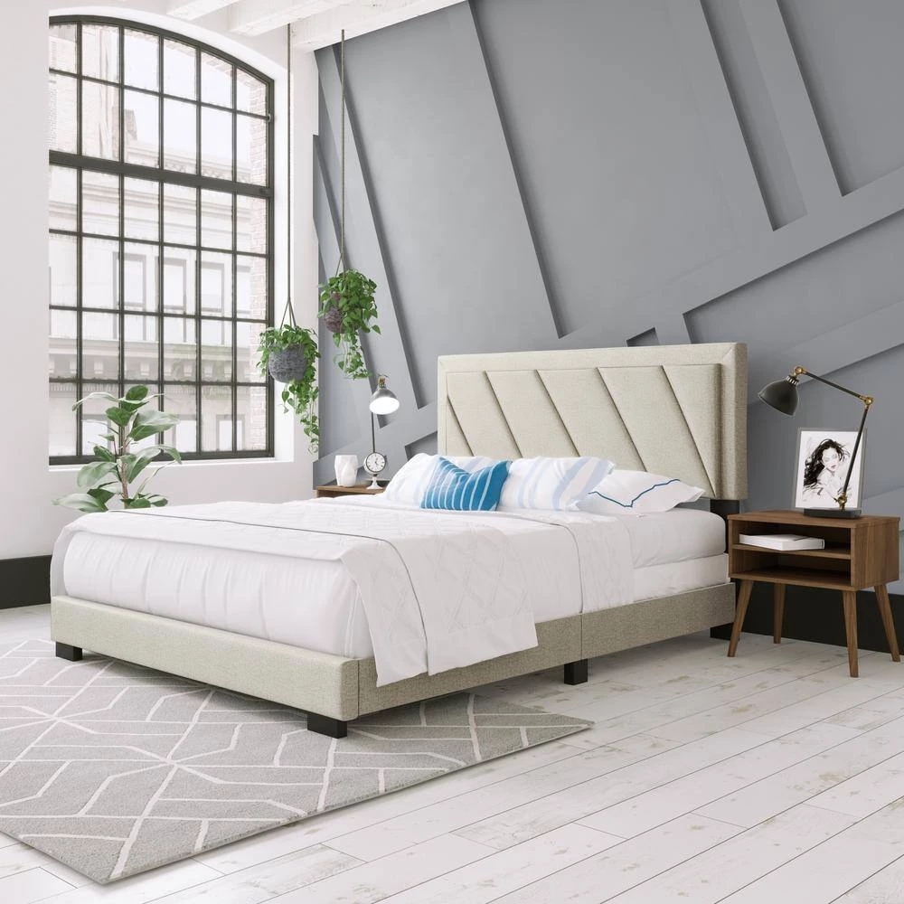 The Sadira Linen Upholstered Platform Bed Frame features graduated stitching detail with a diagonal design on the headboard. Available in a blue/gray or white-black stitching color combinations, this upholstered platform bed will bring timeless elegance to any bedroom. Its graceful simplicity will make it easy to pair with any decor. Conveniently shipped in a single box, you’ll have this bed made up in no time.