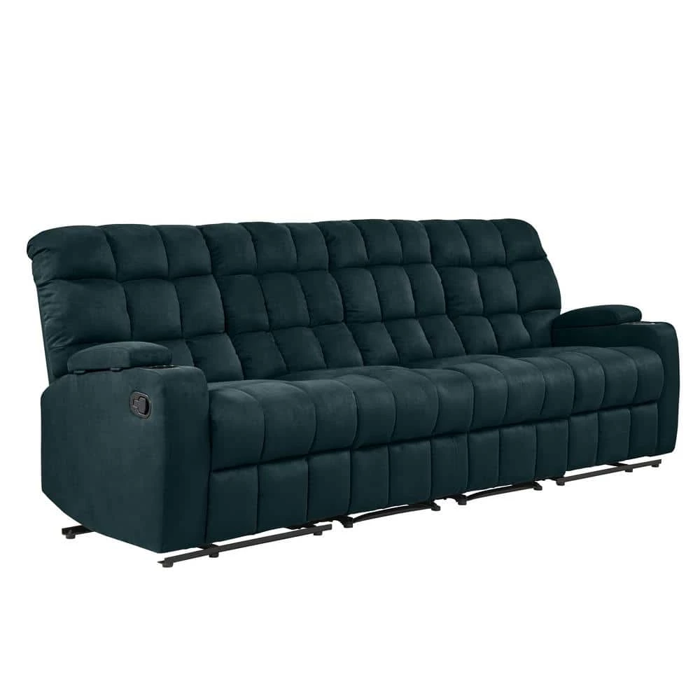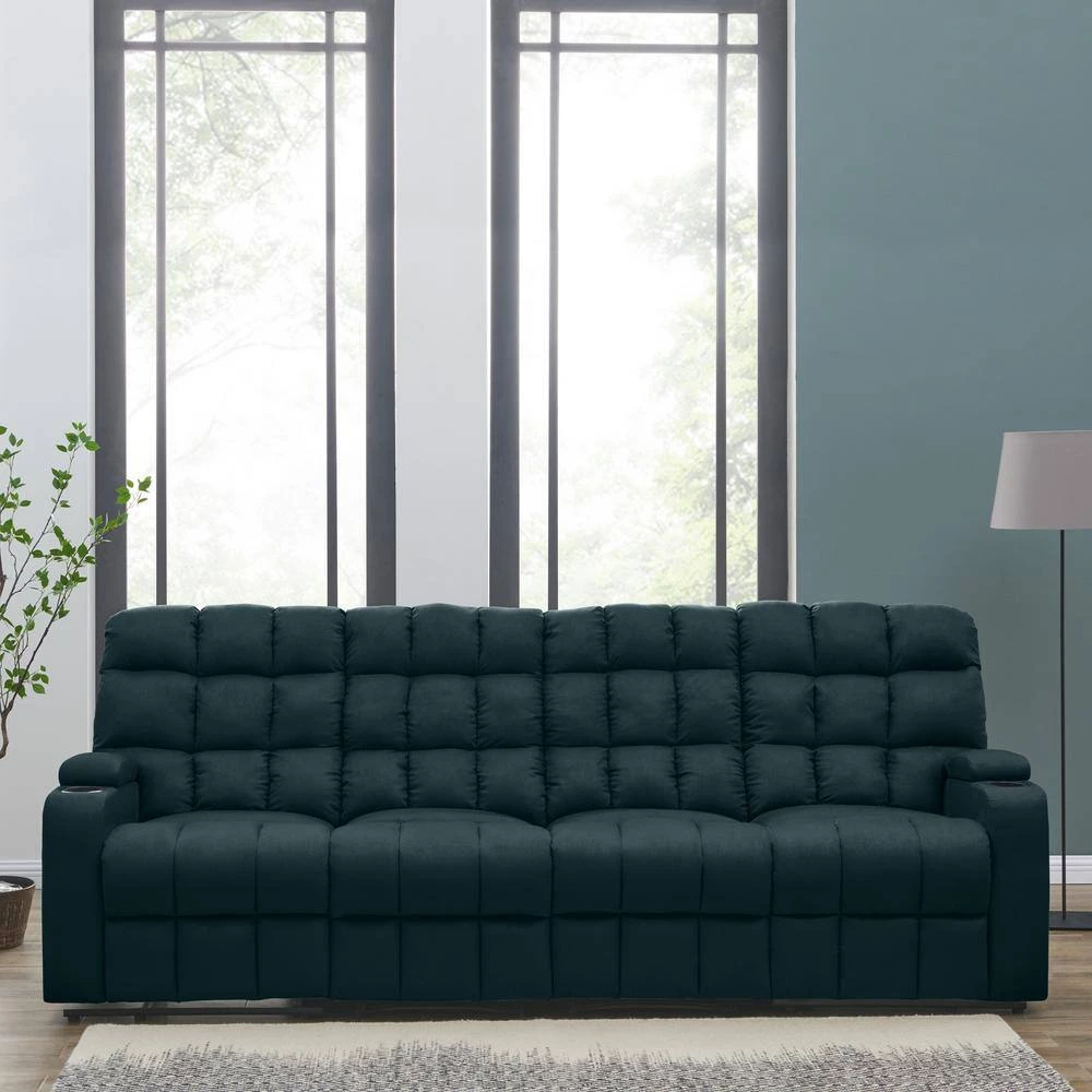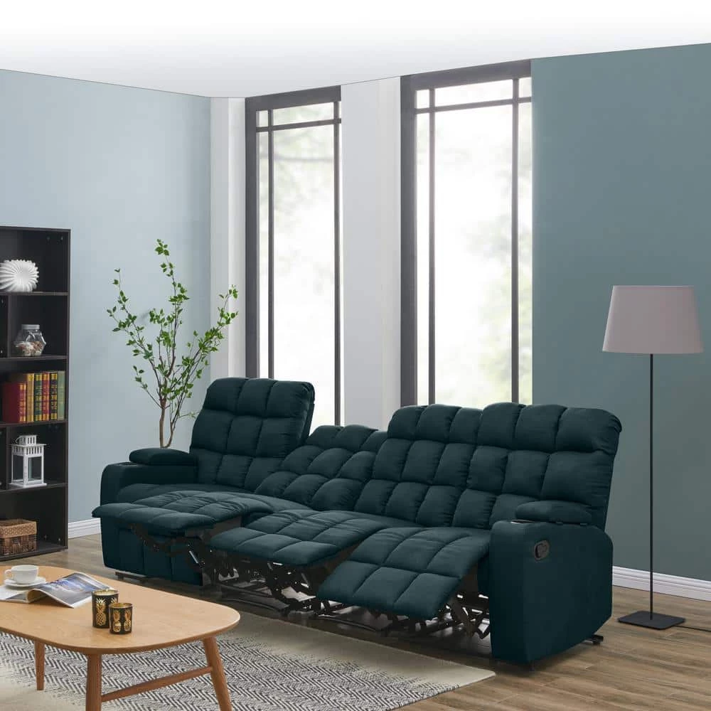 Update your home with this comfortable ProLounger modular wall hugger sofa that sports pillow top arms and is covered in a durable microfiber fabric. The 4-piece sofa recliner includes a left arm, right arm and 2 armless reclining seats that secure together through a button and slot connection on the frames so they will not slip apart. Wall hugger design recliner only needs 4 inches of clearance from the wall to recline and uses less floor space when reclining. Required front clearance is 25 in., Each arm features a cup holder and deep well storage with an easy to open and reach- car door lever on each side for reclining. Each middle armless seat has a concealed parachute release cord for reclining. Covered in a durable, easy clean, stain resistant 100% polyester microfiber fabric. This comfortable sofa is perfect for long-term sitting, TV viewing and relaxed reclining in theater, media and living rooms. Easy connect no tool assembly, simply slide and click together in less than 40 minutes with included instructions. Ships in four (4) boxes. Imported, color may vary.